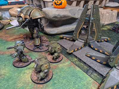 Dave's signature painting style and colour pallet verily explode off these twin Armiger Helverins. I love how unified the schemes of these models are, despite that fact that they are quite different to each other. It is the work of an army collector who knows how to push the boundaries of their paint scheme, blurring the line between what is unique and what is familiar. I'm getting poetic... it must be the verdigris...